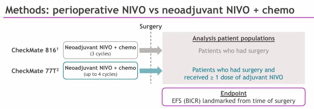 本分析纳入的患者来自CheckMate 77T试验(新辅助纳武利尤单抗+化疗,随后进行手术,术后至少一剂辅助纳武利尤单抗治疗)或CheckMate 816试验(新辅助纳武利尤单抗+化疗,随后进行手术,不进行辅助免疫治疗)。主要终点是从手术时间开始通过盲法独立中央审查(BICR)评估的无事件生存(EFS)。