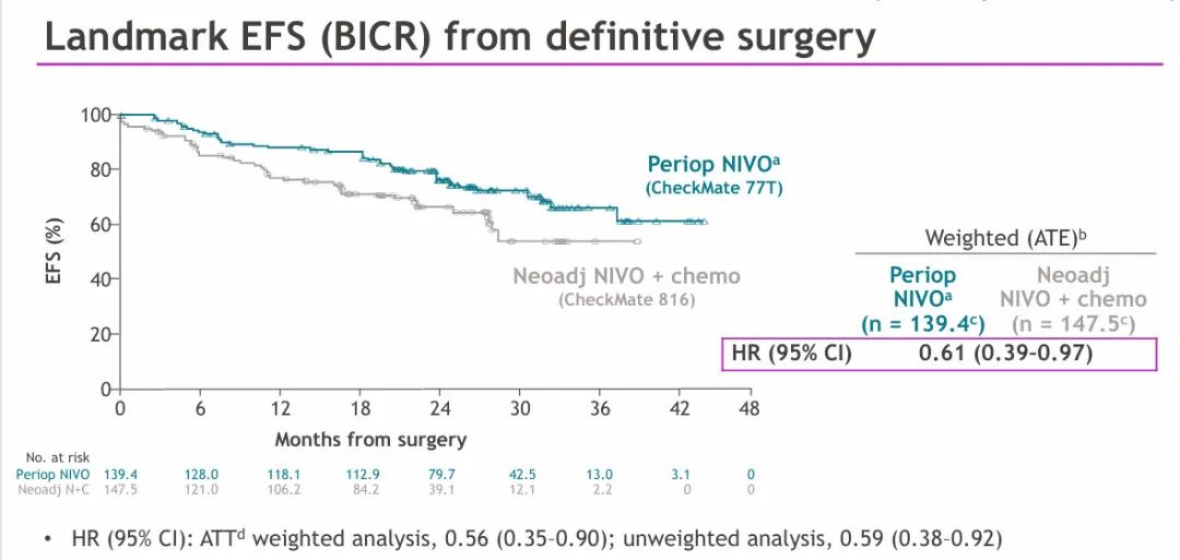 在CheckMate 816和CheckMate 77T试验中,中位随访期分别为29.5个月和33.3个月。在应用倾向评分权重来解释基线特征的差异后,与仅接受新辅助纳武利尤单抗+化疗(N=147)相比,围手术期纳武利尤单抗(N=139)治疗使EFS有所改善。具体而言,EFS的风险比为0.61(加权ATE)和0.56(加权ATT)。对所有接受手术的患者进行未加权分析时,HR为0.59。