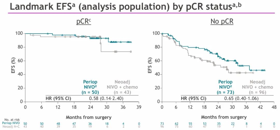在本分析人群中,围手术期治疗的病理完全缓解(pCR)率为40.7%,新辅助治疗的pCR率为30.5%。根据pCR对EFS数据进行分层时,无论pCR状态如何,都观察到围手术期方案相比新辅助方案增加EFS获益,尽管这种EFS获益在未达到pCR且在术后接受辅助纳武利尤单抗治疗的患者中最为明显。