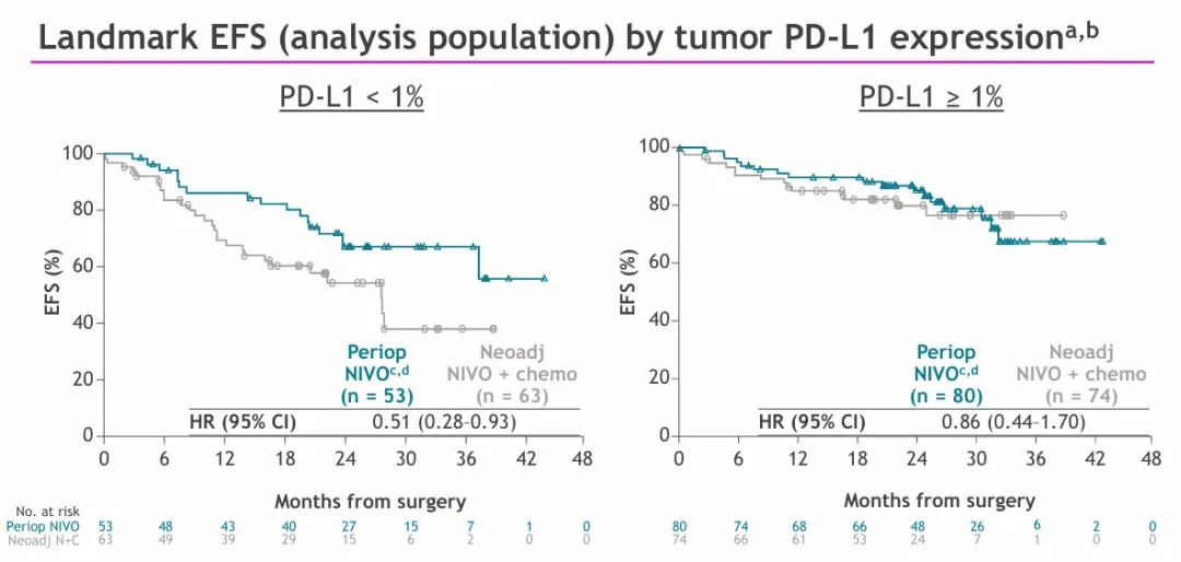 2024 WCLC展示的这项分析比较了CheckMate 77T患者与CheckMate 816患者的EFS。患者数据分析表明,对于可切除NSCLC患者,围手术期治疗比单独使用新辅助治疗显著改善了EFS,无论pCR状态、PD-L1表达水平和肿瘤分期如何,术后接受辅助免疫治疗可能会带来进一步的获益。