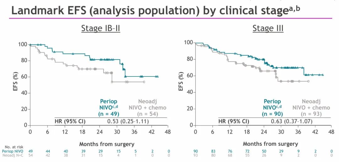 无论肿瘤分期如何,与仅接受新辅助治疗相比,围手术期治疗使EFS结果有所改善,其中IB-II期患者的HR为0.53(95%CI:0.25-1.11),而III期NSCLC患者的HR为0.63(95%CI:0.37-1.07)。