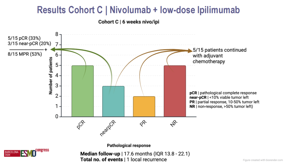 队列D采用nivo/rela双免疫联合治疗的方案,中位随访5.1个月,患者获得了更高的pCR率,47%(7/15)的患者达到了pCR,73%(11/15)的患者达到MPR(肿瘤缩小>90%)。