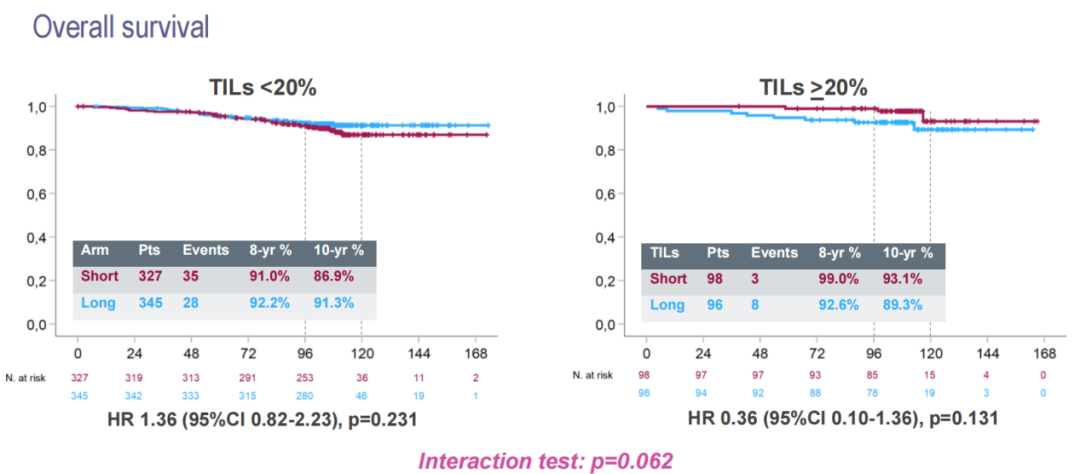 在OS方面,TILs≥20%的患者,标准治疗组与短疗程组的10年OS率分别为89.3%vs 93.1%(HR 0.36,95%CI:0.10~1.36,P=0.131)。对于TILs<20%的患者,标准治疗组与短疗程组10年OS率分别为91.3%vs 86.9%(HR 1.36,95%CI:0.82~2.23,P=0.231,交互作用检验P=0.062)。