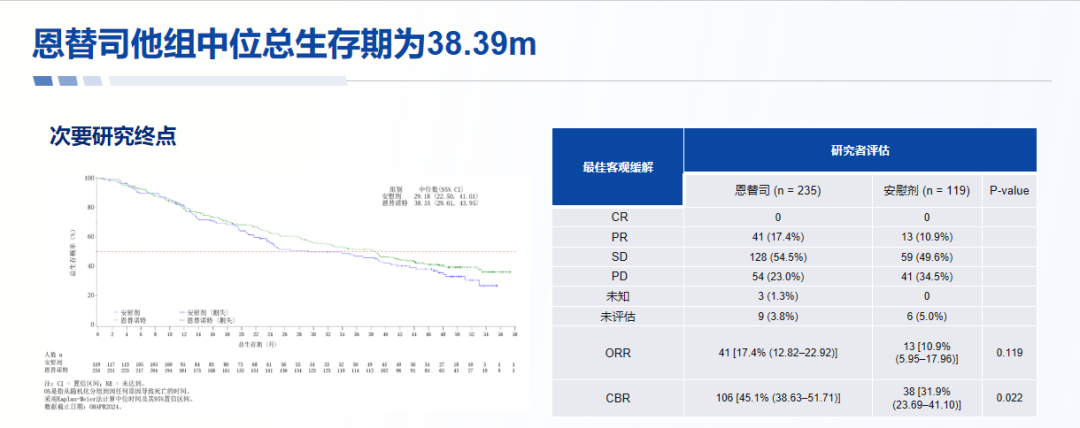 OS方面,恩替司他组的中位OS达到38.39个月,较安慰剂组延长超过9个月(HR 0.83;95%CI:0.62~1.10,P=0.184)。