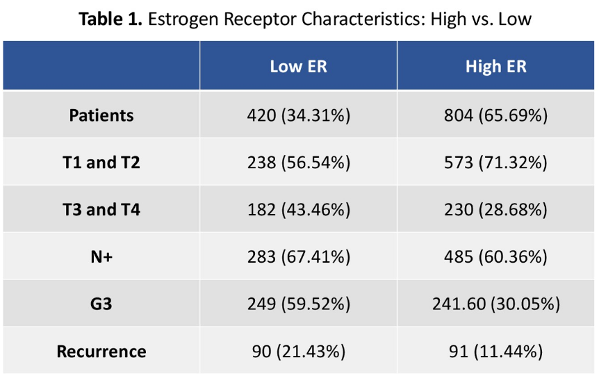 研究方法:该项来自于奇瓦瓦州癌症中心的回顾性研究调查了2012年1月至2023年6月期间1224名年龄≥18岁的ER表达阳性的乳腺癌患者的就诊记录。该研究根据ER表达水平将募集的患者分为两组:ER表达高于10%患者被称为ER高表达组,ER表达水平≤10%被称为ER低表达组。使用皮尔逊卡方检验对临床病理特征及复发率进行详尽的差异分析,并最终获得统计学意义。