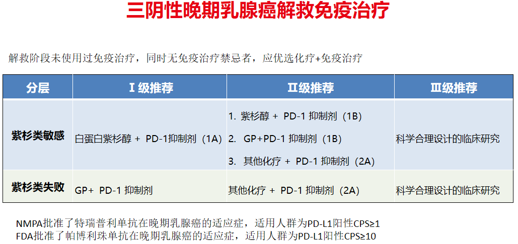 三阴性乳腺癌:对于紫杉类治疗敏感/失败的患者,调整了单药化疗与联合化疗与的顺序,更强调联合治疗的有效性。在紫杉类治疗敏感的患者中,II级推荐新增氟唑帕利联合阿帕替尼(2A)方案,III级推荐增加氟唑帕利(2A)。在紫杉类治疗失败的患者中,II级推荐戈沙妥珠单抗的推荐类别调整为1A类,并新增芦康沙妥珠单抗(2A)的治疗推荐;III级推荐增加氟唑帕利(2A)。此外,指南指出解救阶段未使用过免疫治疗,同时无免疫治疗禁忌者,应优选化疗+免疫治疗,并将PD-1抑制剂的适应证进行了简述,突出了化疗联合免疫治疗在PD-L1阳性人群治疗中的重要地位。