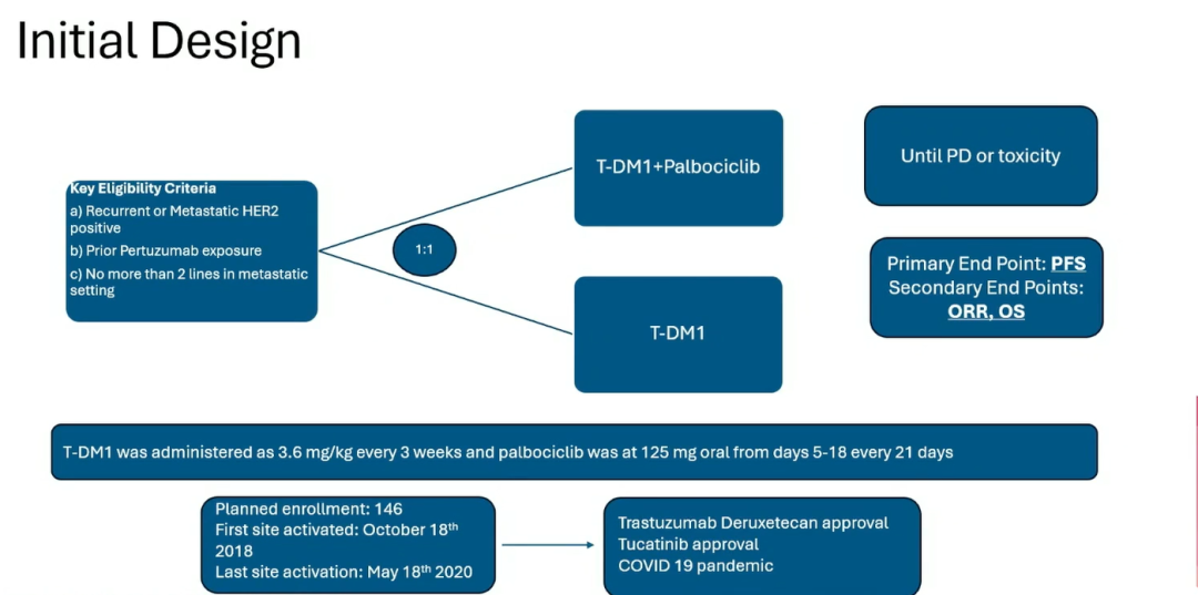 这是一项在HER2+MBC患者中比较T-DM1联合哌柏西利与T-DM1的多中心、随机对照、Ⅱ期临床研究,该研究启动于2018年10月,由于COVID-19流行期间入组进度缓慢,从2021年1月修改为T-DM1联合哌柏西利的单臂研究。研究药物分别为:T-DM1 3.6 mg/kg,每3周给药1次;哌柏西利125 mg,从第5~18天开始口服,每21天1次。关键纳入标准包括既往接受过曲妥珠单抗及帕妥珠单抗双靶向治疗,针对转移性肿瘤接受过≤2线治疗。主要研究终点为无进展生存期(PFS),次要终点包括总缓解率(ORR)和总生存期(OS)。本研究在联合组入组38例患者时,因入组进度缓慢而终止。