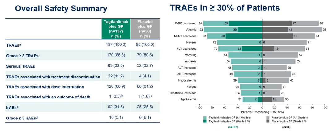 在肿瘤缓解方面,与单独化疗组相比,塔戈利单抗联合化疗组具有更高的ORR(81.7%vs 74.5%);中位持续治疗缓解时间(DoR)延长近1倍(11.7 vs 5.8个月;HR 0.48,95%CI:0.32-0.70)。OS数据尚未成熟,但已显示出塔戈利单抗联合化疗组的获益趋势,目前死亡风险降低38%(HR 0.62,95%CI:0.32-1.22);此外,安全性与既往报道一致,患者的治疗耐受性良好。