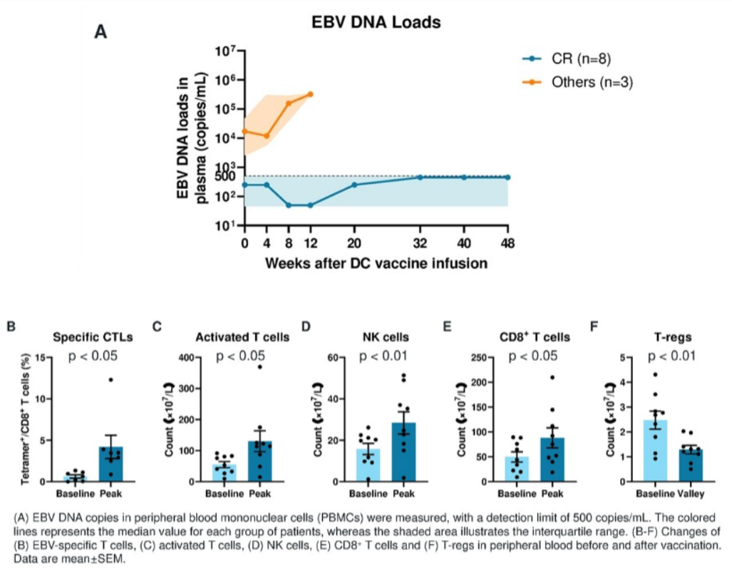 李春蕊教授:这一观察结果是我们研究中最具免疫学指征意义的发现之一。KSD-101通过成熟的树突状细胞这一关键抗原呈递细胞,增强其对EBV相关抗原的处理与呈递功能,从而有效启动并扩增了EBV特异性CD8+T细胞应答。数据显示,患者外周血中CD8+T细胞群体内的EBV特异性T细胞比例由基线的0.61%显著提升至治疗后的4.21%(P<0.05),并伴随CD8+T细胞总量、NK细胞以及活化T细胞数量的协同上调。同时,调节性T细胞(Tregs)数量平均下降至基线的58.14%(P<0.01),提示免疫抑制微环境显著缓解。