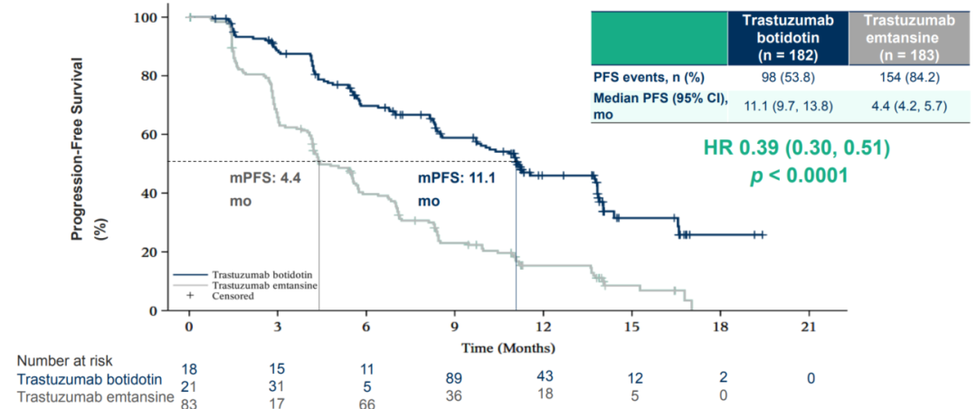 此次公布的结果显示,T-DM1组mPFS为4.4个月,A166组将mPFS延长至11.1个月(HR 0.39;95%CI:0.30,0.51;P<0.0001),达到阳性结果,期待未来OS的进一步验证[1]