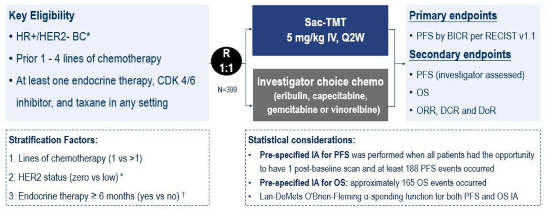 本次ESMO年会中向大家公布的OptiTROP-Breast02研究主要聚焦HR+/HER2-晚期乳腺癌,要求所有患者均接受过1-4线化疗,且至少接受过1次CDK4/6i、内分泌治疗及紫杉类治疗。该研究共纳入399例患者,均为CDK4/6i经治且至少接受过1次化疗,按1:1随机分组后分别予以sac-TMT或研究者选择的化疗方案(ICC)。