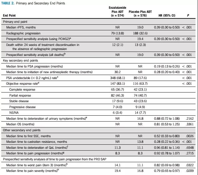 ARCHES研究是一个多中心随机、安慰剂对照的III期临床研究,它对比了ADT联合恩杂鲁胺及ADT联合安慰剂治疗无症状或轻度症状的M-HSPC患者的有效性及安全性数据。该研究选取了共202个中心2016年3月至2018年1月的M-HSPC患者共1150例,1:1随机分组,最终1146例患者入组用药。其中727名患者(63.2%) 为高肿瘤负荷患者(CHAARTED高肿瘤负荷定义),同时该研究还纳入了205名(17.9%)既往接受过多西他赛化疗的患者以及145名(12.6%)既往接受过放疗的患者。该研究以rPFS(包括治疗结束后24个月之内发生的未发生影像学进展的死亡)作为主要研究终点,以至PSA进展时间(TTPP)、至新的抗肿瘤治疗时间(TTNAT)、PSA反应率、至排尿症状恶化时间、总生存(OS)作为次要终点,其他次要终点还包括至有症状的骨相关事件时间、至去势抵抗时间、至生活治疗恶化时间以及至疼痛进展时间。中位随访时间14.4个月。