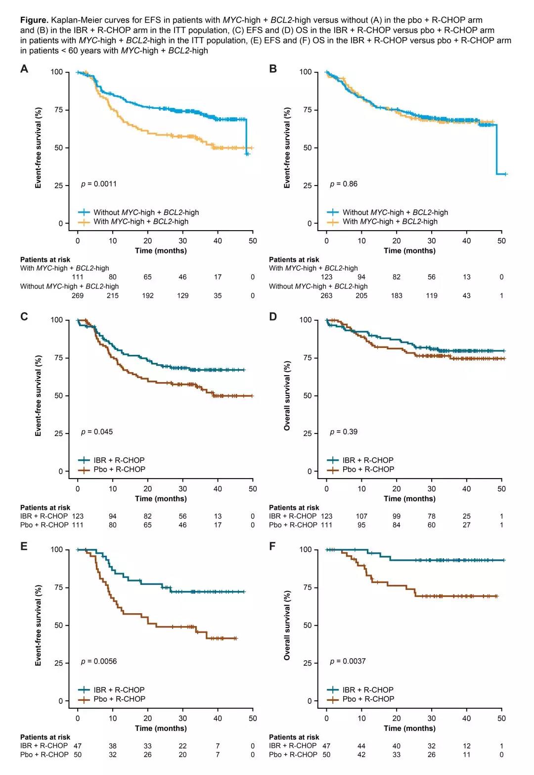结论:伊布替尼+R-CHOP方案可为BCL-2、MYC同时高表达的初治non-GCB DLBCL带来EFS获益,但无OS获益。在<60岁人群中,伊布替尼组的EFS或OS显著优于安慰剂组,而在≥60岁人群中生存无差异。本研究表明,伊布替尼+R-CHOP方案可为特定的BCL-2、MYC同时高表达人群带来生存获益,需要后续其他队列的研究予以证实。