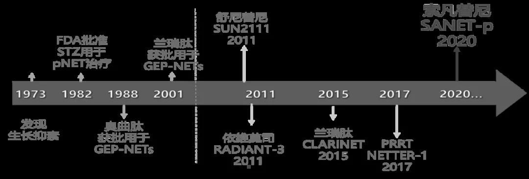 图2. 胰腺神经内分泌肿瘤的药物研发历程