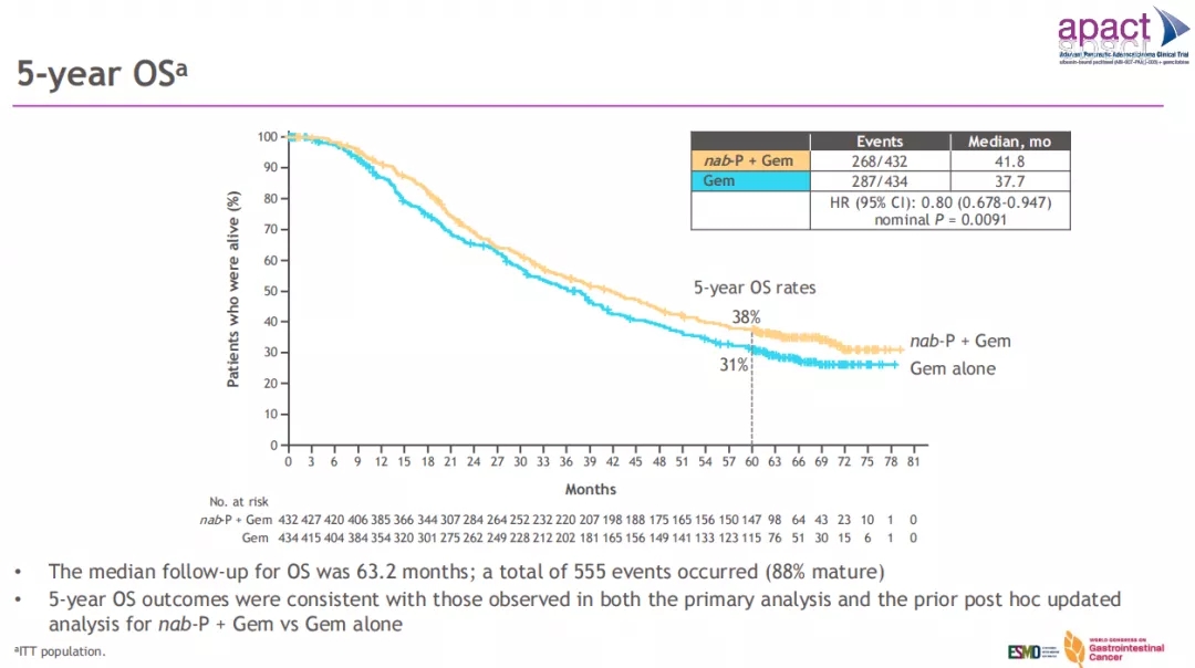 摘要LBA1:白蛋白结合型紫杉醇加吉西他滨对比吉西他滨单药用于已手术切除胰腺癌的辅助治疗的Ⅲ期APACT研究:最新5年OS结果