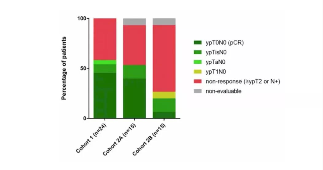 30名患者被随机分配到A组(n=15)或B组(n=15)。26/30(87%)名患者接受了所有3个周期治疗。4名患者因IRAE错过了一个或多个疗程。26/30患者接受了根治性手术,24例在开始治疗后12周内手术。1例患者(B组)在术前治疗发生进展(可评估,非缓解),3例患者(A组1例,B组2例)在影像学缓解时拒绝接受根治性手术;1例(B组,基线cT4aN3)进行了淋巴结清扫,显示微转移(可评估,非缓解)。在A组中,6/14例(43%)患者达到pCR;8/14例(57%)患者达到pCR或ypTisN0。在B组中,1/14例(7%)达到pCR,3/14例(21%)达到pCR或ypTisN0。