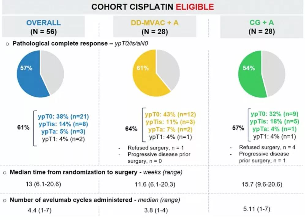 在中期分析数据截止时,共有56例患者可评估疗效。CG+A组(n=28):中位年龄为69岁(41-81岁),64%为男性,7%为cT4,7%为cN+。DD-MVAC+A组(n=28):中位年龄为62岁(51-77岁),79%为男性,7%为cT4,7%为cN+。