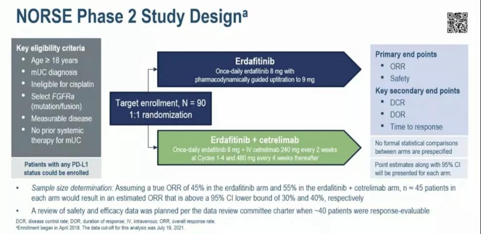 2期NORSE研究纳入患者为≥ 18岁的mUC,存在FGFRa(突变/融合)和可测量的疾病(之前没有针对mUC的全身治疗,cis不耐受)。患者被随机(1:1)分配至:每天一次ERDA 8 mg(药效学指导上调[UpT]至9 mg)或ERDA8 mg(无UpT) + CET(前4周期240 mg,每2周一次IV;4周期后改为480mg,每2周一次 IV)。主要终点是研究者根据RECIST 1.1评估的总体应答率(ORR)和安全性;其次是疾病控制率(DCR)、反应时间(TTR)和反应持续时间(DOR)。