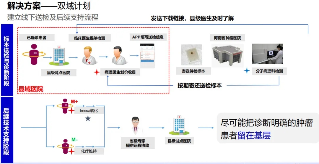 “双域计划”采用“线上+线下”的合作模式,设计了线上APP,利用APP实现线上作业;县级医院可通过快递把标本送到区域精准检测中心,并在线上APP填写送检信息;区域精准检测中心在线上提供诊断报告和规范化治疗方案,通过APP回传;县级医院的医生根据这些高质量的检测结果指导靶向或免疫治疗用药,省级专家可提供远程协助。