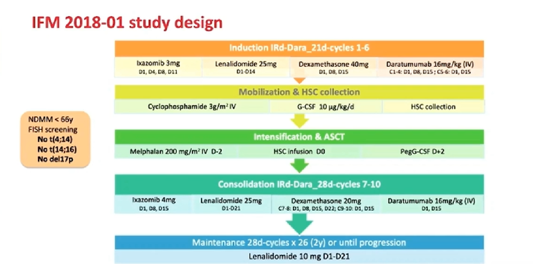 这次在美国血液学年会还报告了一项Ⅱ期临床研究,用达雷木单抗(Daratumumab)、伊沙佐米(Ixazomib)联合来那度胺和地塞米松(DIRD)治疗一线标危、适合移植的新诊断多发性骨髓瘤患者的疗效(大会摘要号:464)。