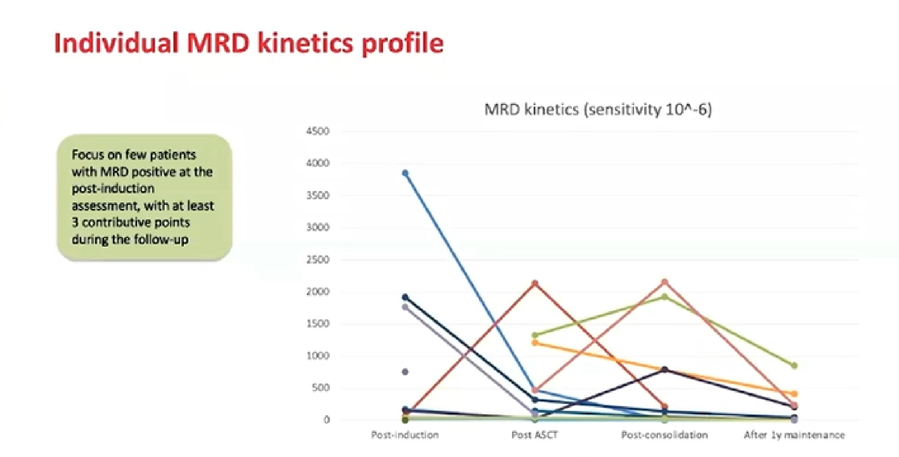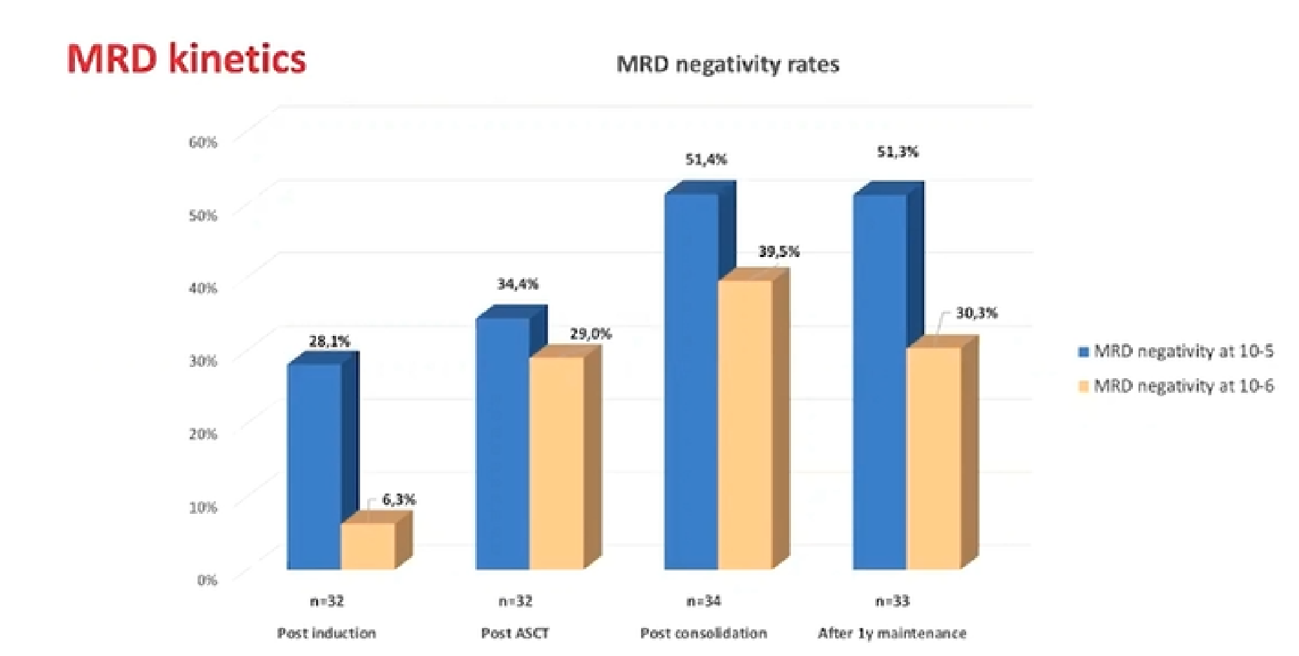 共有32例患者参与该项临床研究。由于是四药联合,我们不仅要看它的有效性,更多的是探讨在10-5或10-6MRD阴性患者的比例。从这个试验结果来看,它提示我们在诱导治疗、移植后以及巩固治疗、甚至维持治疗,DIRD四药联合的患者无论10-5或10-6都能获得非常高的MRD阴性比例。在诱导治疗、移植后或巩固治疗后10-5MRD阴性患者比例是51.4%,如果按10-6来算能达到39.5%,患者能够持续一年MRD阴性的比例是51.3%。也就是说如果这个患者诱导治疗、巩固治疗以后能够获得MRD阴性,那么这个患者能够持续缓解1年的MRD阴性。尤其是10-6的缓解深度更深,在巩固治疗后39.5%的患者获得了MRD阴性,如果经过一年的随访,还有30.3%的患者能够保持10-6MRD阴性,特别是高危人群,如果能够获得10-6MRD阴性,那么患者可能缓解得更好,生存时间更长。