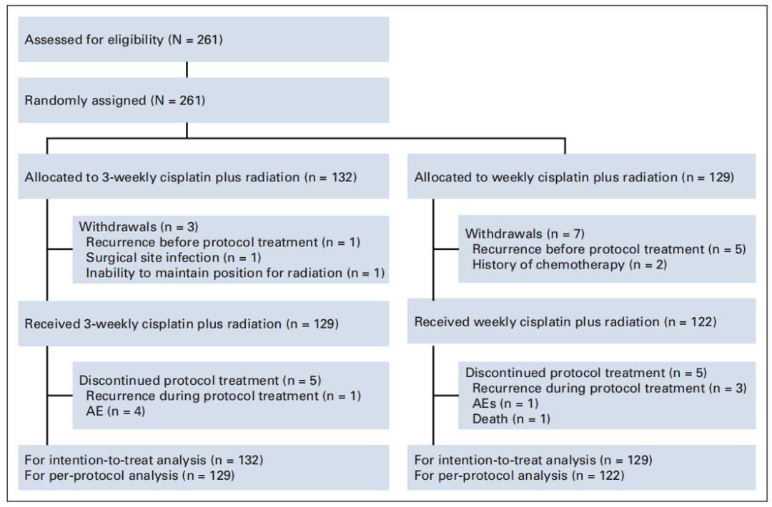 据估计,全球头颈部鳞癌(SCCHN)每年新诊断病例数超过70万例。其中,大多数患者被诊断为局部晚期SCCHN(LA-SCCHN),手术治疗是可切除癌症的主要治疗手段。术后每3周100 mg/m2顺铂联合放疗方案,是高危复发患者的标准治疗方案。然而,由于大剂量化疗给患者治疗带来的相关毒性和3周化疗剂量的给药不足引起了人们的关注。同时,顺铂周疗+放疗的广泛使用,提示其可以作为一种替代方案。尽管一些结果之间存在冲突,但每3周和每周顺铂治疗的meta分析比较表明,这两种方案间具有相同的疗效2-7。