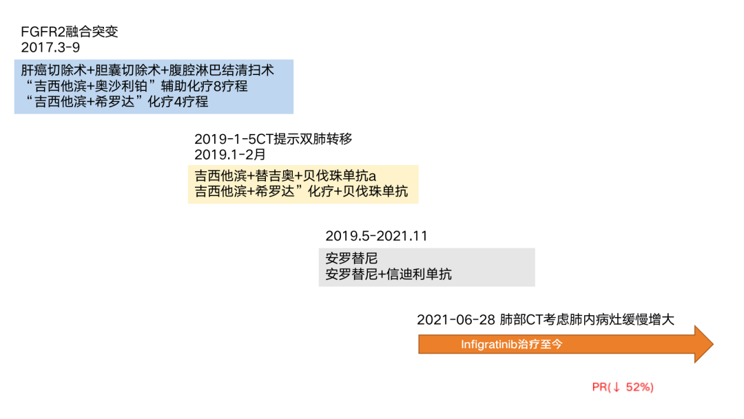 2021年12月,患者就诊于博鳌乐城医疗先行区,ECOG评分 1 分,肿瘤标志物——糖类抗原(CA19-9)为47.41U/ml。2021年12月15日,行“Infigratinib 125mg qd”治疗,2022年1月6日因肝功能异常,Infigratinib减量至100mg qd,1周期后肿瘤即明显缩小,达到PR。三个治疗周期后肺部肿瘤靶病灶长径最大缩小约  52%,非靶病灶(肺部)亦明显缩小。目前,患者仍继续使用Infigratinib靶向治疗,耐受性良好。