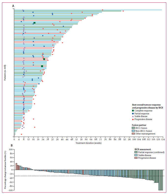 [2] Milind Javle, et al. Infigratinib (BGJ398) in previously treated patients with advanced or metastatic cholangiocarcinoma with FGFR2 fusions or rearrangements: mature results from a multicentre, open-label, single-arm, phase 2 study. Lancet Gastroenterol Hepatol 2021; 6: 803-15.