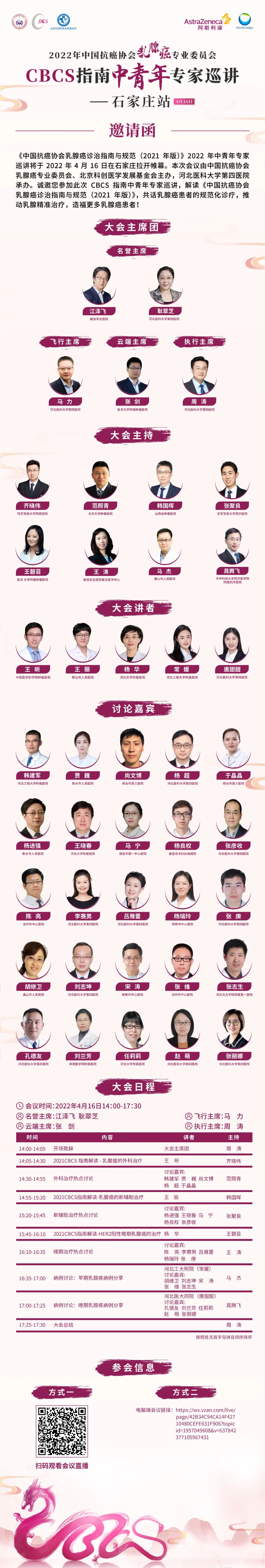 《中国抗癌协会乳腺癌诊治指南与规范(2021 年版)》2022年中青年专家巡讲将于2022年4月16日在石家庄拉开帷幕。