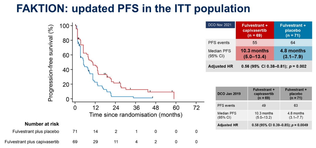 ITT人群的PFS数据与此前相同(10.3 vs 4.8个月),但HR更新为0.56(95%CI:0.38~0.81;P=0.002)。值得注意的是,采用NGS增加检测位点后,PI3K/AKT/PTEN通路对PFS有影响:PA患者中Capivasertib组和氟维司群组的PFS分别为12.8个月和4.6个月(HR 0.44,95%CI:0.26~0.72;P=0.001);而PNA患者中分别为7.7和4.9个月(HR 0.70,95%CI:0.40~1.25;P=0.23)。