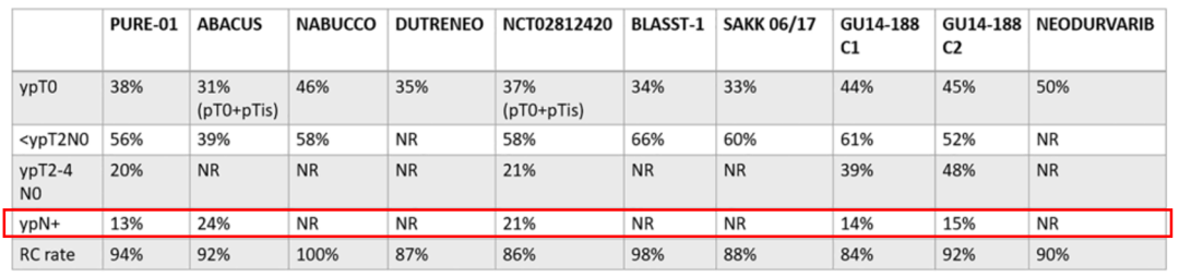 (4)是否有新辅助治疗疗效预测的工具?近年来,有不少液态活检作为新辅助疗效预测工具的伴随诊断研究传递了积极信号。例如,今年ASCO-GU报道国内一项采用患者尿液肿瘤DNA(utDNA)检测微小残存疾病(MRD)的研究显示,根据RECIST 1.1标准,2例CR患者为MRD -,90%的PR和所有SD/PD患者为MRD +;根据病理评估结果,50%的CR患者为MRD-,所有非CR患者为MRD+[7]。
