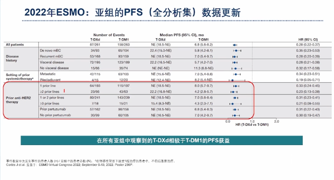 亚组分析显示,无论患者雌激素受体状态、既往是否接受过帕妥珠单抗治疗、是否有内脏疾病,都可以从T-DXd治疗中获益。2022年ESMO大会上,DB-03研究亚组的PFS(全分析集)数据进行了更新,可以看到患者既往治疗线数并未对T-DXd治疗获益产生影响。