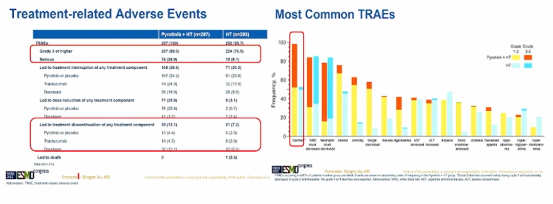 安全性方面,与既往报道的数据一致,未发现新的安全性信号。PHILA研究最常见的≥3级TRAE是中性粒细胞计数下降(62.6%vs 65.2%)、白细胞计数下降(53.2%vs 50.9%)和腹泻(46.5%vs 3.1%),3级腹泻主要发生在第1周期,第2周期及以后显著减少,未发生4级或5级腹泻,严重TRAE发生率分别为24.9%和6.1%,治疗相关死亡的发生率分别为0和0.3%。