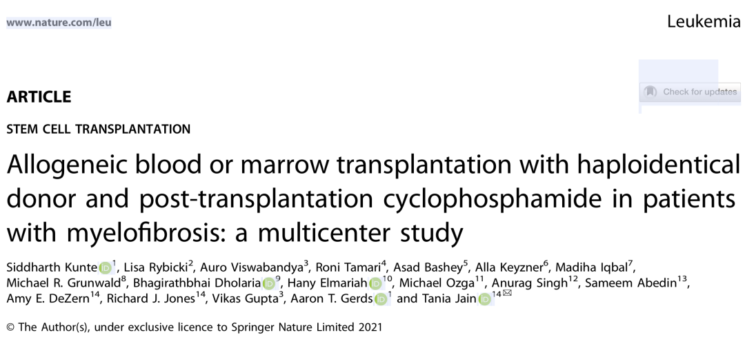 Kunte S,Rybicki L,Viswabandya A,Tamari R,Bashey A,Keyzner A,Iqbal M,Grunwald MR,Dholaria B,Elmariah H,Ozga M,Singh A,Abedin S,DeZern AE,Jones RJ,Gupta V,Gerds AT,Jain T.Allogeneic blood or marrow transplantation with haploidentical donor and post-transplantation cyclophosphamide in patients with myelofibrosis:a multicenter study.Leukemia.2022 Mar;36(3):856-864.doi:10.1038/s41375-021-01449-1.Epub 2021 Oct 18.PMID:34663912.