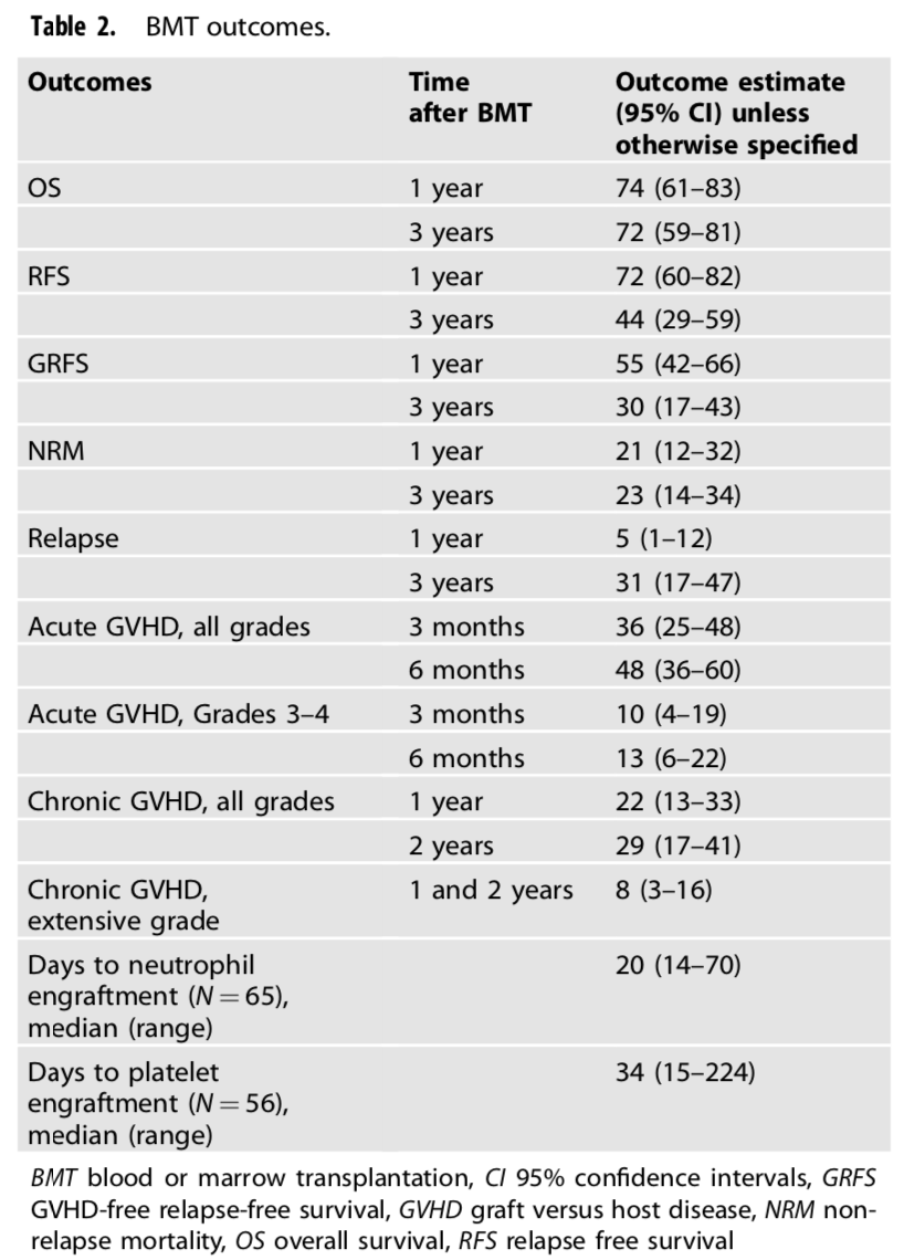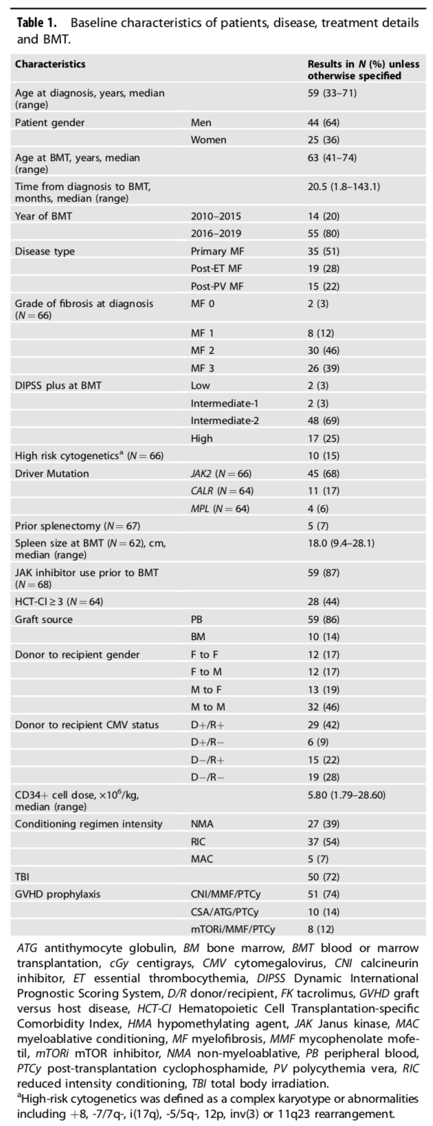 脾脏可测量的67名患者中,有5名患者(7%)因潜在的骨髓纤维化继发的症状性脾肿大而接受脾切除术。在骨髓移植前,所有5名患者都接受了JAK抑制剂治疗。所有患者中性粒细胞均获得植入,中位植入时间为20天(范围,15-30天)。5名患者中,3名患者最终因疾病复发死亡,其余2名患者在最后一次随访时存活,中位缓解期为16个月。