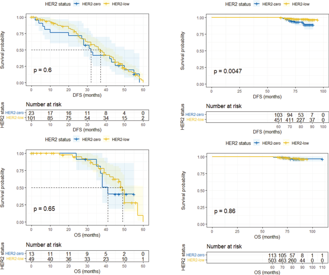 本研究在早期乳腺癌患者中比较了不同HR状态下的HER2-0与HER2低表达组间的临床病理学特征和预后情况。从长远来看,在HR阳性队列中,HER2低表达乳腺癌患者群体相比于HER2-0群体有更好的DFS。