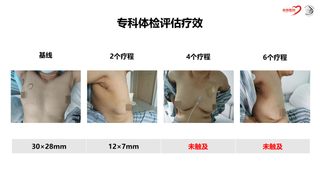 NAC期间每间隔2个化疗周期进行疗效评估,2周期后乳房肿块和腋窝淋巴结明显退缩,4周期后临床触诊阴性,6周期后影像学评估cCR,具体如下: