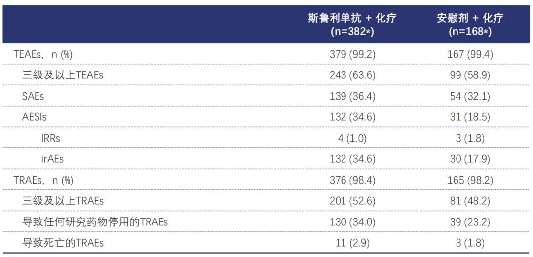 安全性方面,斯鲁利单抗联合化疗显示出良好的安全性,研究期间未观察到新的安全信号(图4)。最常见的免疫相关不良事件包括免疫介导性甲状腺功能减退(10.7%vs.2.4%)、免疫介导性皮炎(6.3%vs.3.0%)、免疫介导性甲状腺功能亢进症(4.5%vs.2.4%)。