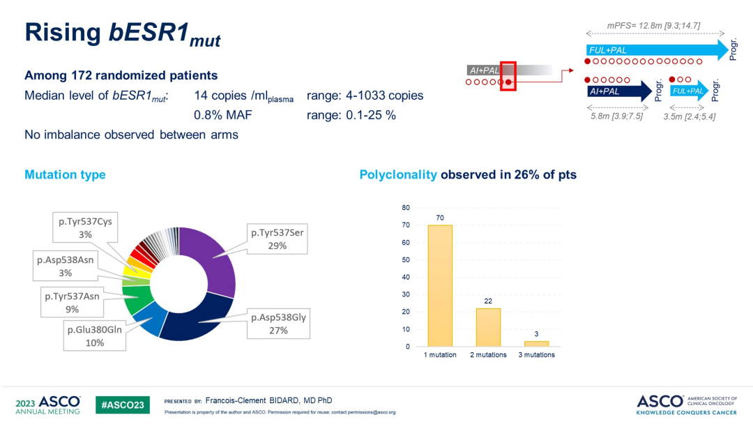 此次数据公布还发现,在突变类型方面,bESR1m最常见的是Y537S位点突变,约有26%左右的患者是多克隆突变(图3)。