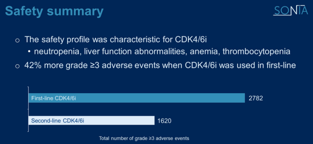 经过两组患者的比较,我们可以看到,一线患者治疗中选择CDK4/6抑制剂和二线治疗中选择CDK4/6抑制剂,总体的PFS和OS没有显著统计学差异。而当一线使用CDK4/6抑制剂时,患者≥3级不良事件增加42%。此外,每位患者的治疗费用也会增加将近20万美金。