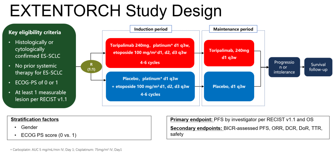 EXTENTORCH研究是一项随机、双盲、安慰剂对照、多中心、III期临床研究,在全国48家中心纳入442例经组织学或细胞学证实为广泛期小细胞肺癌(ES-SCLC)、既往未接受过全身系统治疗、美国东部肿瘤协作组体力状况评分(ECOG-PS)评分为0或1、且根据RECIST v1.1标准至少存在一个可测量肿瘤病灶的患者。