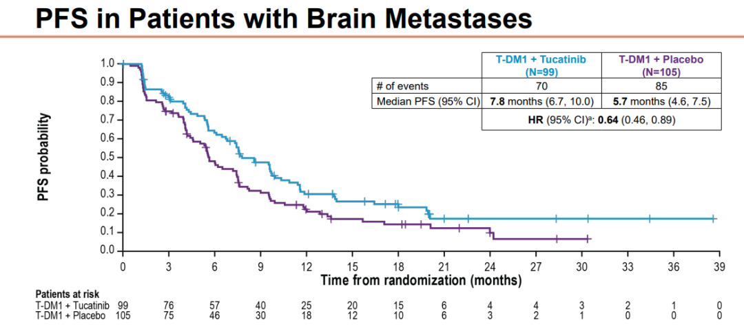 图卡替尼+T-DM1组和安慰剂+T-DM1组脑转移患者分别有99例和105例,包括活动性脑转移和稳定性脑转移。结果显示,图卡替尼+T-DM1组较安慰剂+T-DM1组可改善总人群mPFS(9.5 vs.7.4个月,HR=0.76,P=0.0163)和脑转移患者mPFS(7.8 vs.5.7个月,HR 0.64),对于脑转移患者的OS尚不成熟。安全性方面,最常见的TEAE(≥20%),为恶心、腹泻、虚弱、肝毒性等。本研究初步证实了ADC联合TKI对乳腺癌脑转移的疗效改善,同样值得进一步探索。