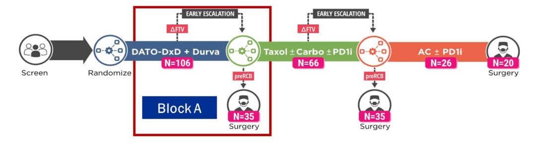 因此,这次ASCO大会报道的I-SPY 2.2研究,把目光聚焦在Dato-DXd之上。A阶段分别探讨了Dato-DXd单药或者联合Durva新辅助治疗的疗效和安全性,其中Dato-DXd单药队列的103例患者中有33例(32%)提前手术;Dato-DXd+Durva队列的106例患者中有35例(33%)提前手术。
