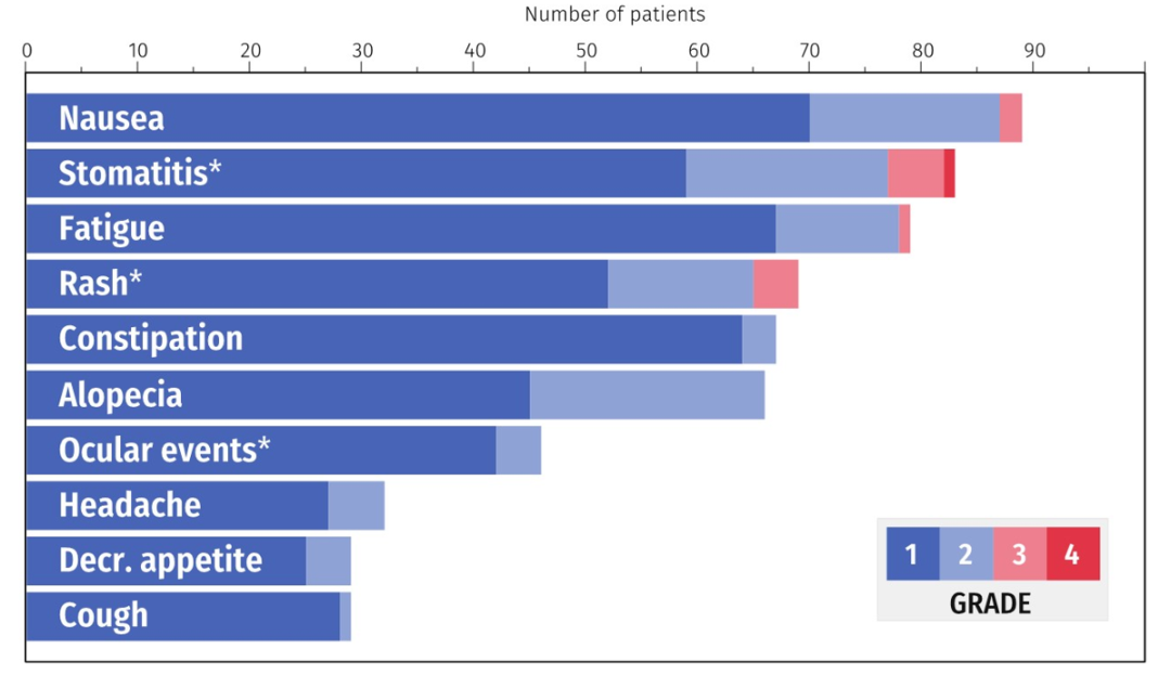 在安全性方面,两个队列报道的不良事件(AE)类型与既往相同。我们主要关注联合免疫治疗是否显著增加毒副作用?从Dato-DXd+Durva队列来看,联合治疗最常见的不良事件是恶心、口腔炎、疲劳、皮疹、便秘、脱发等,但大多数为1/2级AE;Dato-DXd和Durva相关AE的停药率仅分别2%和5%。